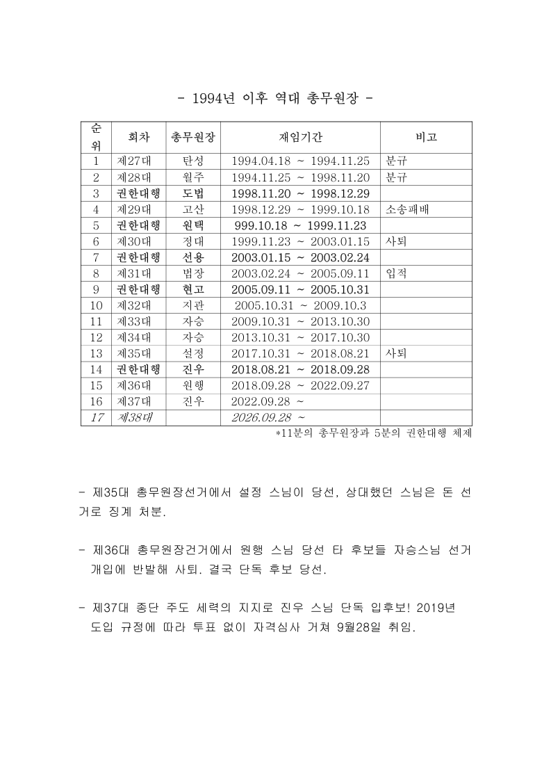 그간 총무원장 선거의 타락상을 보도한 사회 언론이 부지기수다. 법과 원칙에 따르지 않아 대중의 지지를 받지 못하고 당선된 총무원장과 그 행정부에 대한 사회 및 종단 내부의 신뢰도에는 분명 한계가 있다.